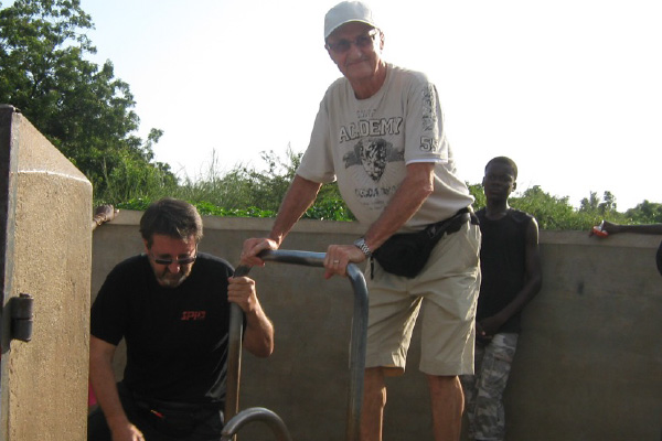 Our founder Paul Tremblay accompanied by our colleague Yvan Tremblay installing a well giving access to clean water throughout the village.