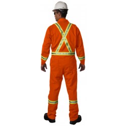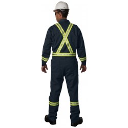 The Flame-Resistant Work Coverall with Reflective Material offers dependable protection, visibility, and comfort for industrial environments. Made in Canada from Westex™ UltraSoft® (88% cotton / 12% nylon, 9 oz), it delivers lightweight durability and long-lasting flame resistance. Equipped with 3M™ Scotchlite™ reflective trim (¾" silver / 2" fluorescent) for 360° visibility, it features a Nomex® taped two-way brass zipper, covered YKK® snaps, and flame-resistant Nomex® thread for safety and strength. The pleated action back, adjustable cuffs, and multiple reinforced pockets ensure mobility, comfort, and functionality. Certified to ASTM 1506, CSA Z462, NFPA 2112, and NFPA 70E, this Category 2 (ATPV 12.4 cal/cm²) coverall meets CSA Z96 Class 1 Level FR visibility standards for reliable protection on the job.