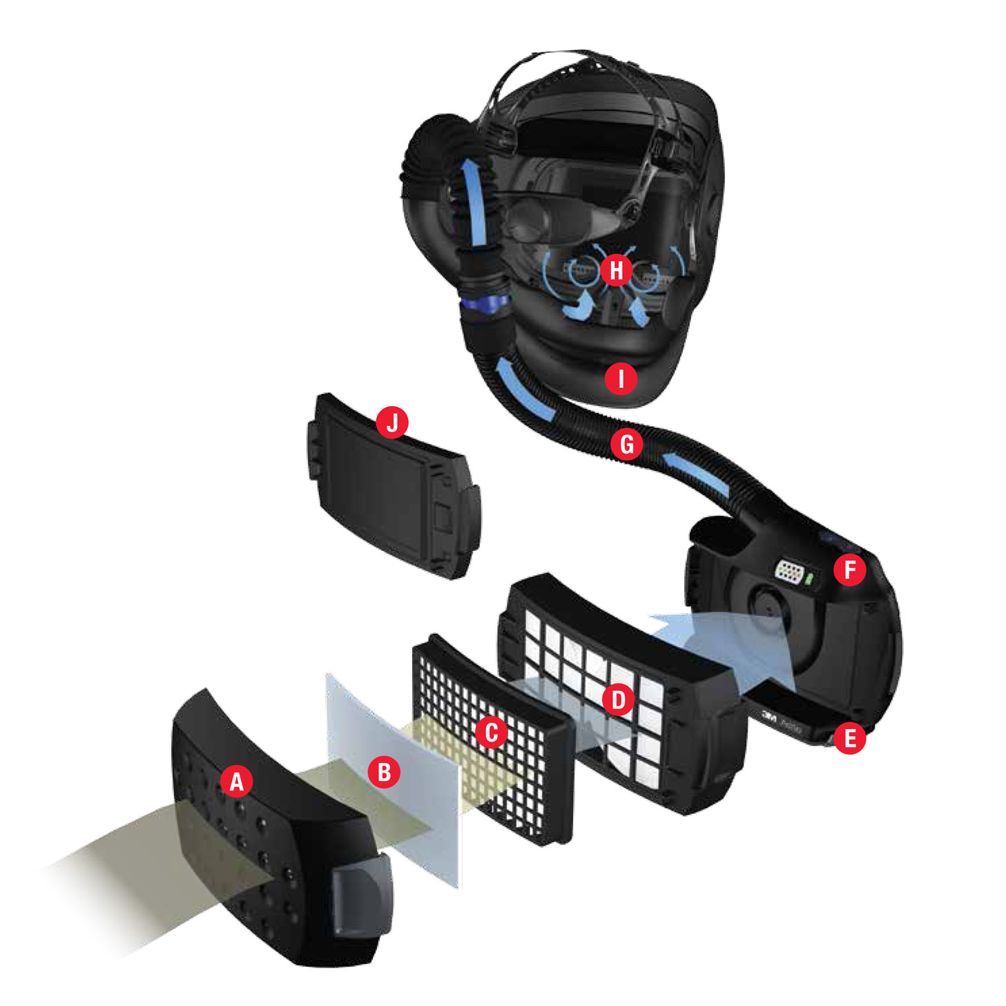 - Airflow pattern: evenly distributes filtered air throughout the entire breathing zone of the helmet. The intelligent turbo unit keeps the airflow rate at a constant, preset level.