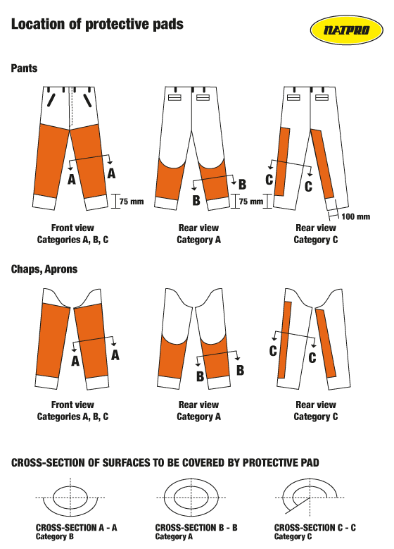 Class A: The class A pants protect around each leg (360 degrees). The protection starts a maximum of 5 cm from the bottom of the leg and ends at least 20 cm above the crotch at the front and a minimum of 50 cm below the crotch at the back.
