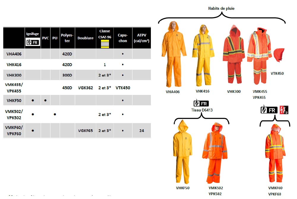 Lors de journée pluvieuse, les habits de pluies, comme le VMK455 présenté plus bas, sont parfaits pour être enfilés par-dessus une veste en polar qui agit à titre de doublure. Lorsque la pluie cesse, le travailleur peut continuer à travailler avec seulement sa veste sans devoir porter un gros manteau imperméable. En situation contraire, s’il continue à pleuvoir et la température se réchauffe, il est possible d’enlever la doublure en polar.