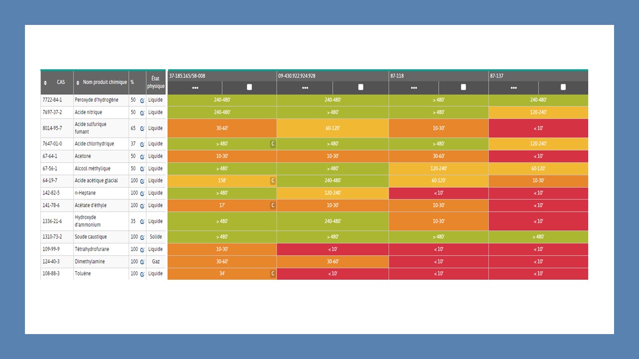 Tableau de la résistance des produits Ansell aux différents produits chimiques