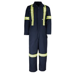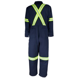 Flame-Resistant Reflective Material placement provides enhanced visibility with 2 vertical stripes on the front, a horizontal stripe around each arm, a horizontal stripe around each leg and an “X” on back.